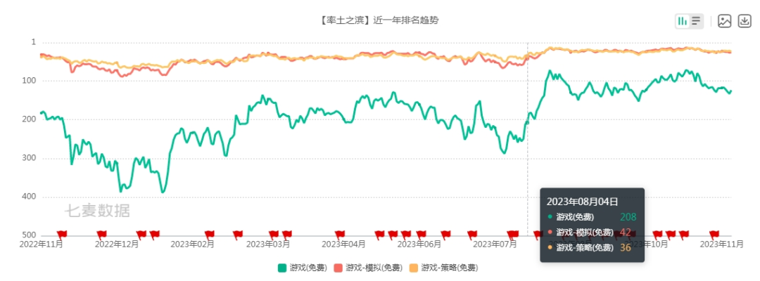 在此期间,《率土之滨》手游热度一路高涨。根据七麦数据显示,从8月份起,《率土之滨》在免费游戏榜单中排名不断上涨,到8月16日突破了今年的最高峰,并且热度一直持续至今。
