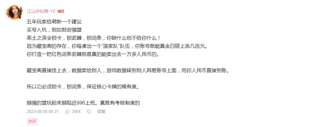 在叮当猫开“率土”系列视频的第一期,点赞第一的评论是一名《率土之滨》老玩家对新人的建议,其中最后一条是:“别加那些强盟。越强的盟玩起来越贴近996上班,真就有考核制度的。”
