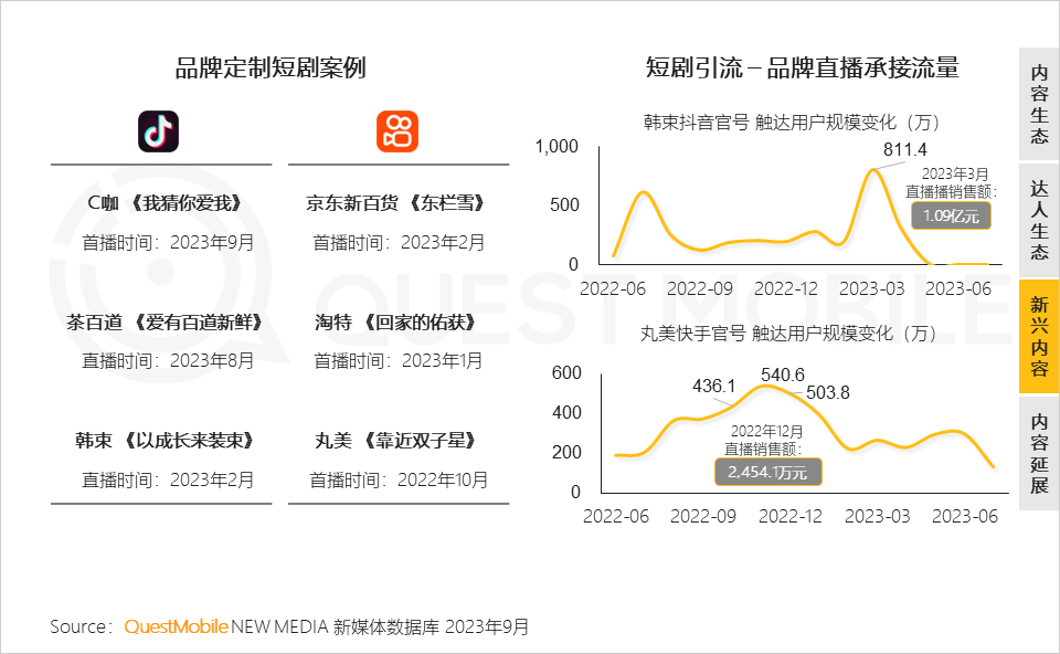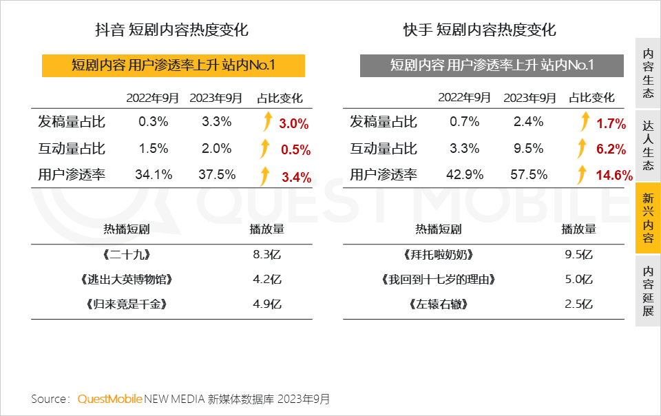 6、2023年可谓短剧元年,作为另一种内容形式,短剧在抖音、快手“火速出圈”;反转、紧凑、过瘾的剧情特点容易带着用户“情绪起伏”,沉浸其中
