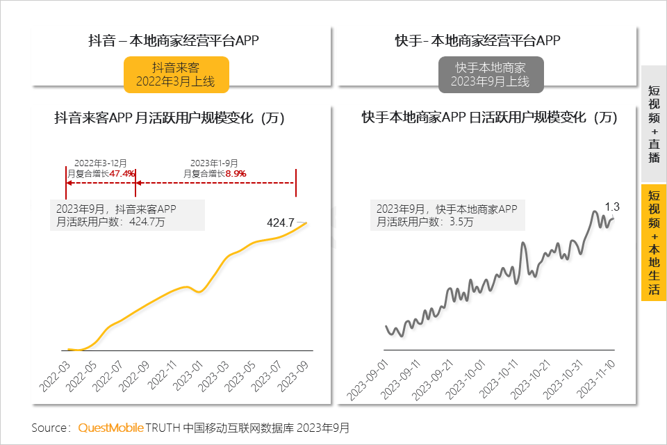 QuestMobile数据显示,抖音来客APP在2023年9月月活达424.7万,今年1-9月月复合增长率在8.9%;快手本地商家APP于今年9月上线,日活一路增长。