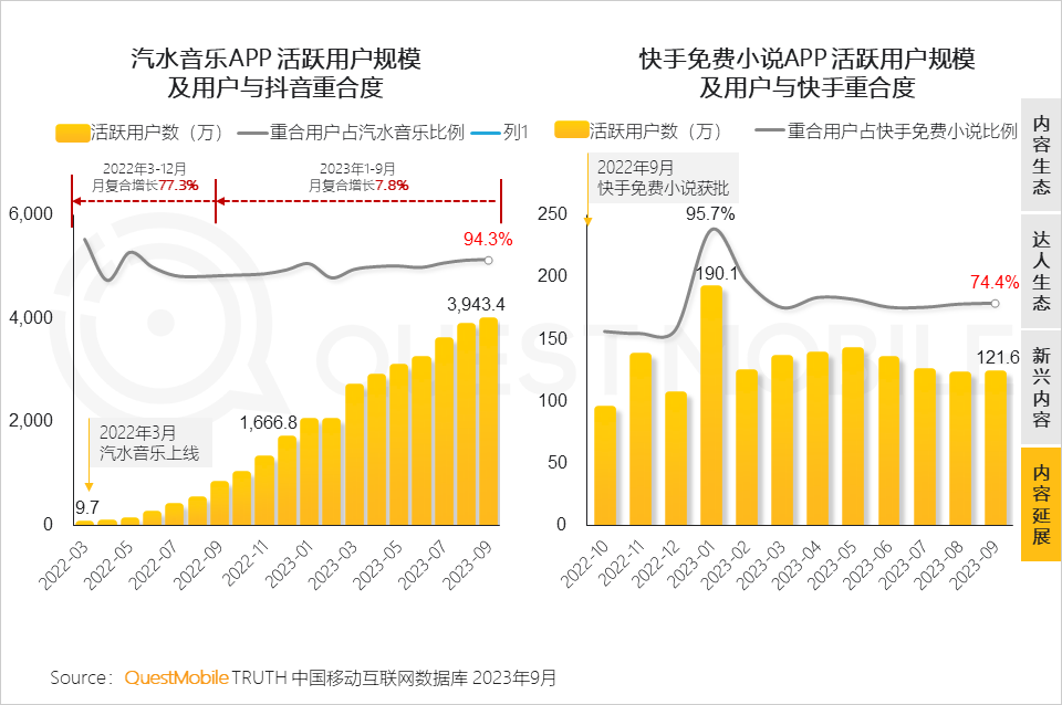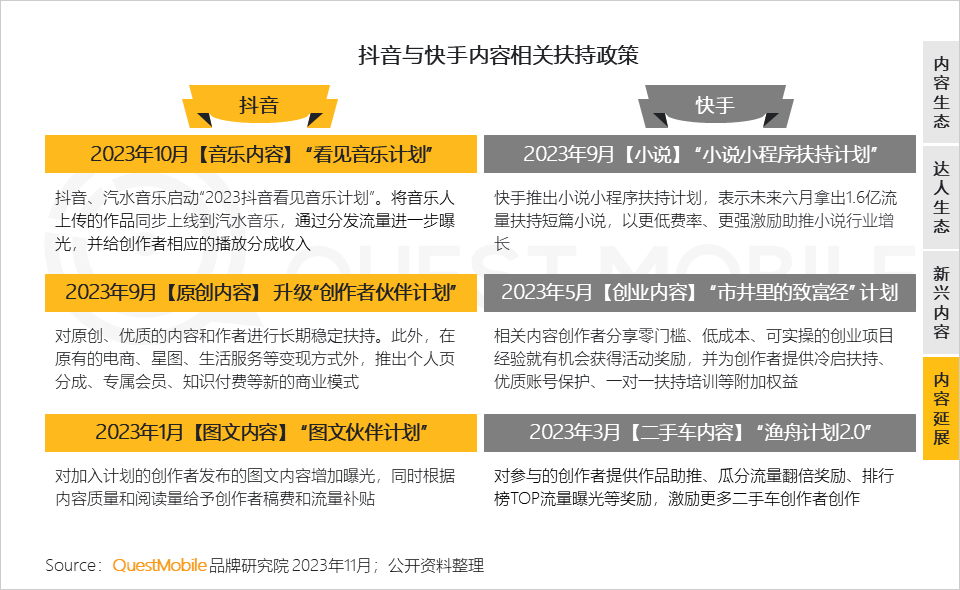 抖音发力图文内容,以更轻、更高效的方式实现差异化,快手则从垂类方向着手,如创业内容、二手车内容;此外,两者均在尝试另外一种传播介质,如抖音-音乐内容、快手-小说内容,并与自身现有的APP形成联动。