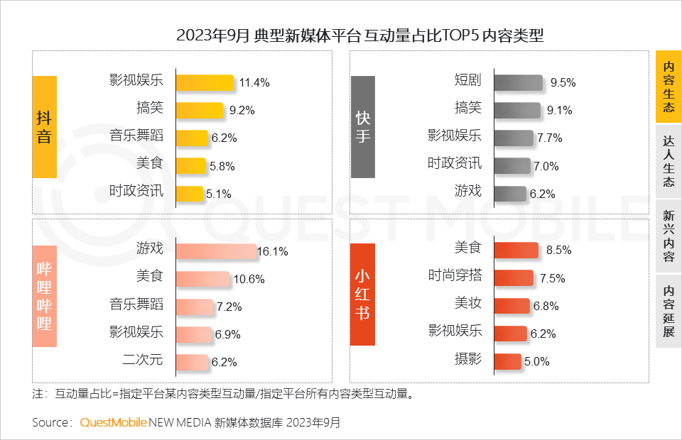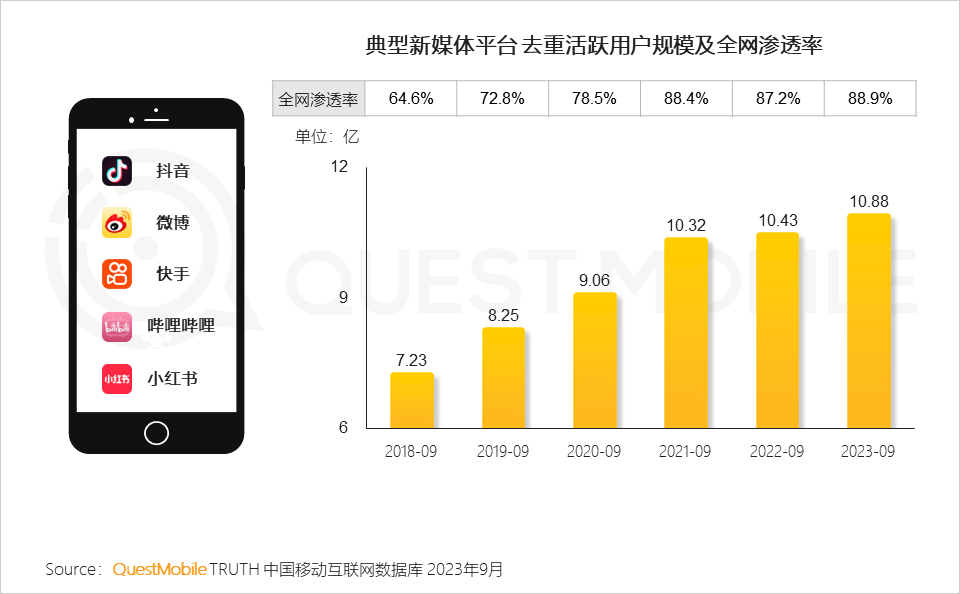 QuestMobile数据显示,2023年9月,五大新媒体平台去重活跃用户规模10.88亿,全网渗透率达88.9%。![]()
