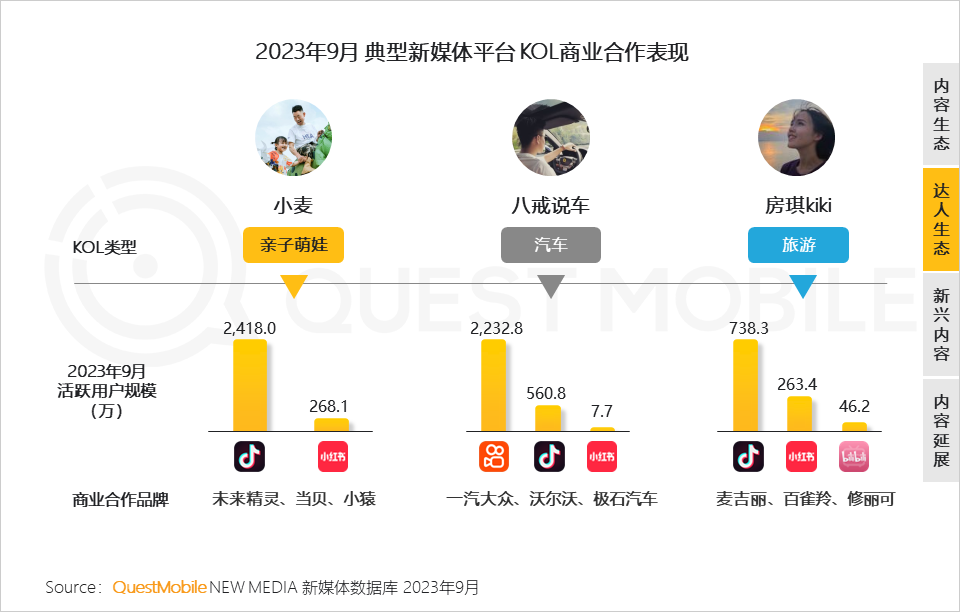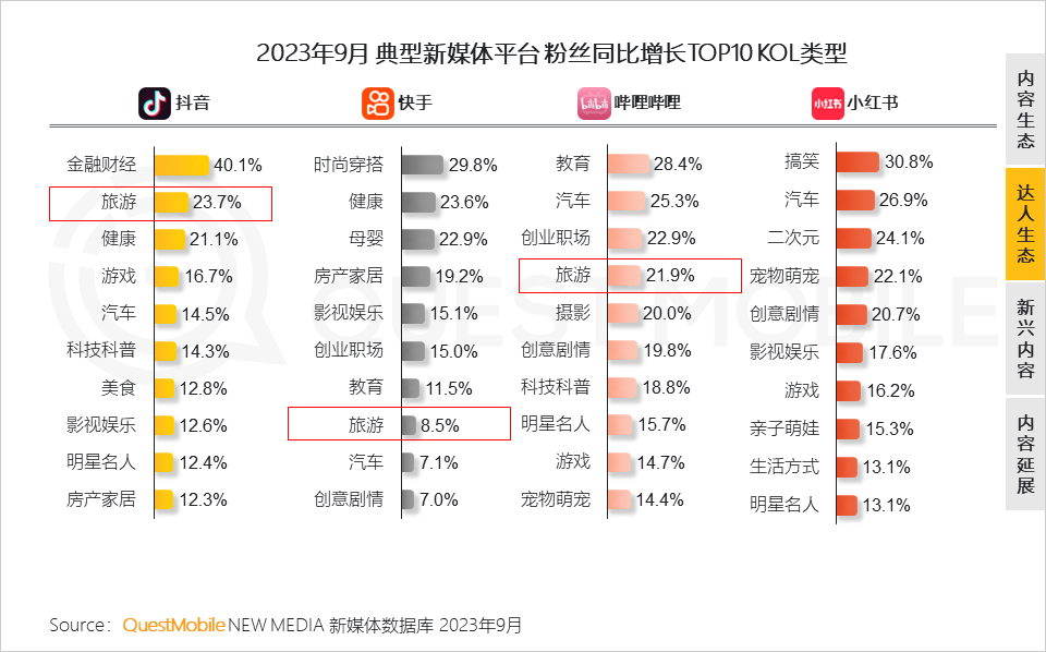 QuestMobile 数据显示,旅游类KOL在抖音、快手、哔哩哔哩均有良好表现,这也与当下文旅市场火热有关;快手今年5月推出的针对创业者的内容扶持计划也带动了创业职场KOL的粉丝增长。