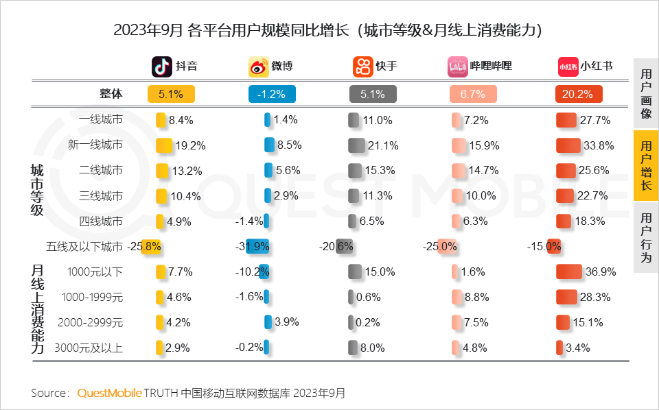 3、微博、哔哩哔哩、小红书在一二线发达城市的强渗透带动高消费人群占比;快手则是三线及以下市场用户聚集地