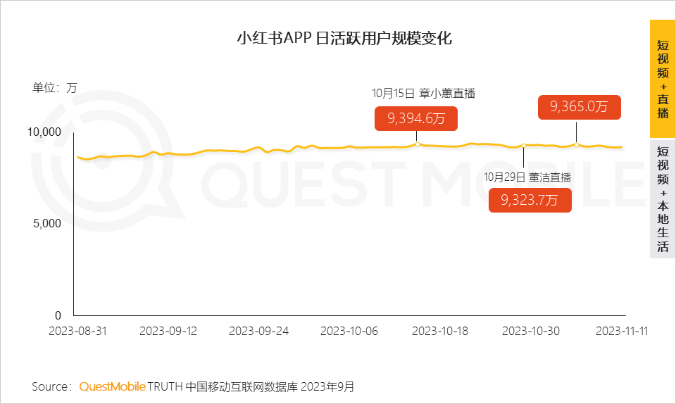 4、QuestMobile数据显示,章小蕙开播当日,小红书日活达到近阶段高峰;双11活动也让其流量攀升至阶段性小高峰章小蕙、董洁直播当日,11月5日双11活动“BIG DAY”的日活分别在9,394.6万、9,323.7万和9,365.0万。