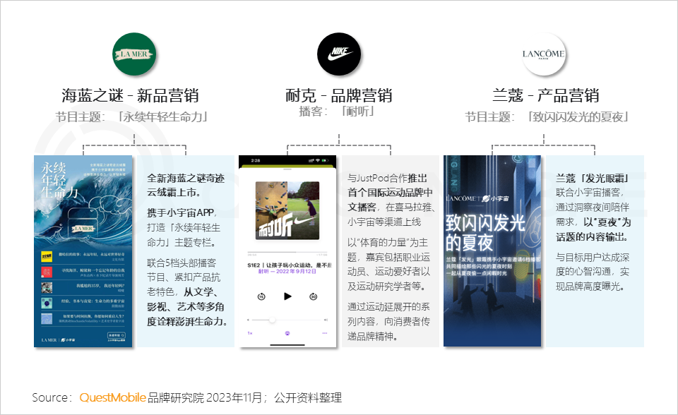 作为一种新的传播介质,播客的内容创作会“更重”、“更厚”,主打潜移默化地输出一种生活方式或品牌理念,海蓝之谜、耐克和兰蔻正是这一类的典型代表。