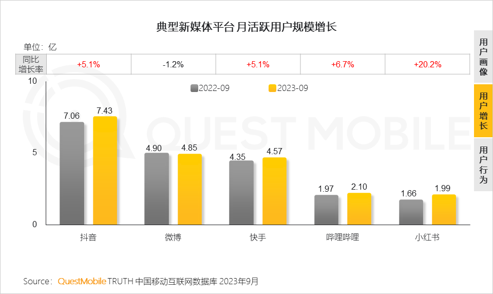 QuestMobile数据显示,截止到2023年9月,抖音、快手、小红书、哔哩哔哩、微博五大典型新媒体平台去重活跃用户规模达到10.88亿,渗透率达到88.9%,三大梯队态势基本形成,其中,抖音以7.43亿月活、同比5.1%增速独占鳌头,第二阵营微博、快手月活分别为4.85亿、4.57亿,同比分别增长-1.2%、5.1%,哔哩哔哩和小红书位居第三阵营,月活分别为2.1亿、1.99亿,同比分别增长6.7%、20.2%。