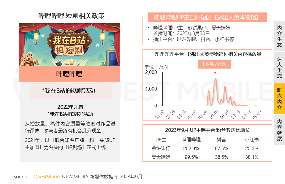 QuestMobile数据显示,由哔哩哔哩UP主自制的短剧《逃出大英博物馆》收视良好,也让两位UP主实现了粉丝增长。