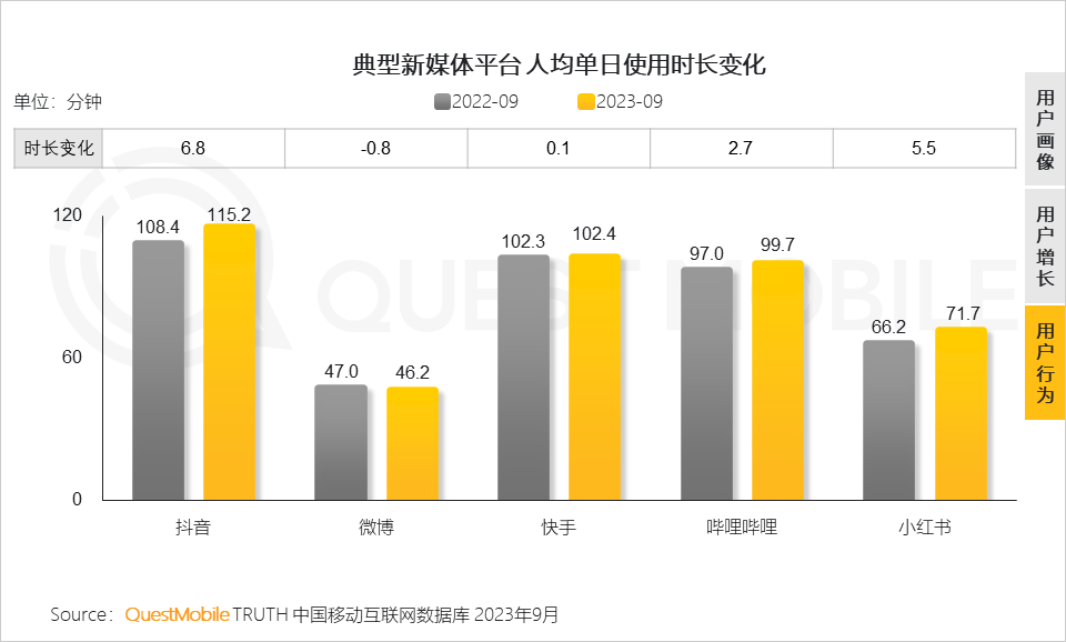 QuestMobile数据显示,抖音人均单日使用时长从去年9月的108.4分钟提升至115.2分钟,小红书提升至71.7分钟,较去年增加了5.5分钟。
