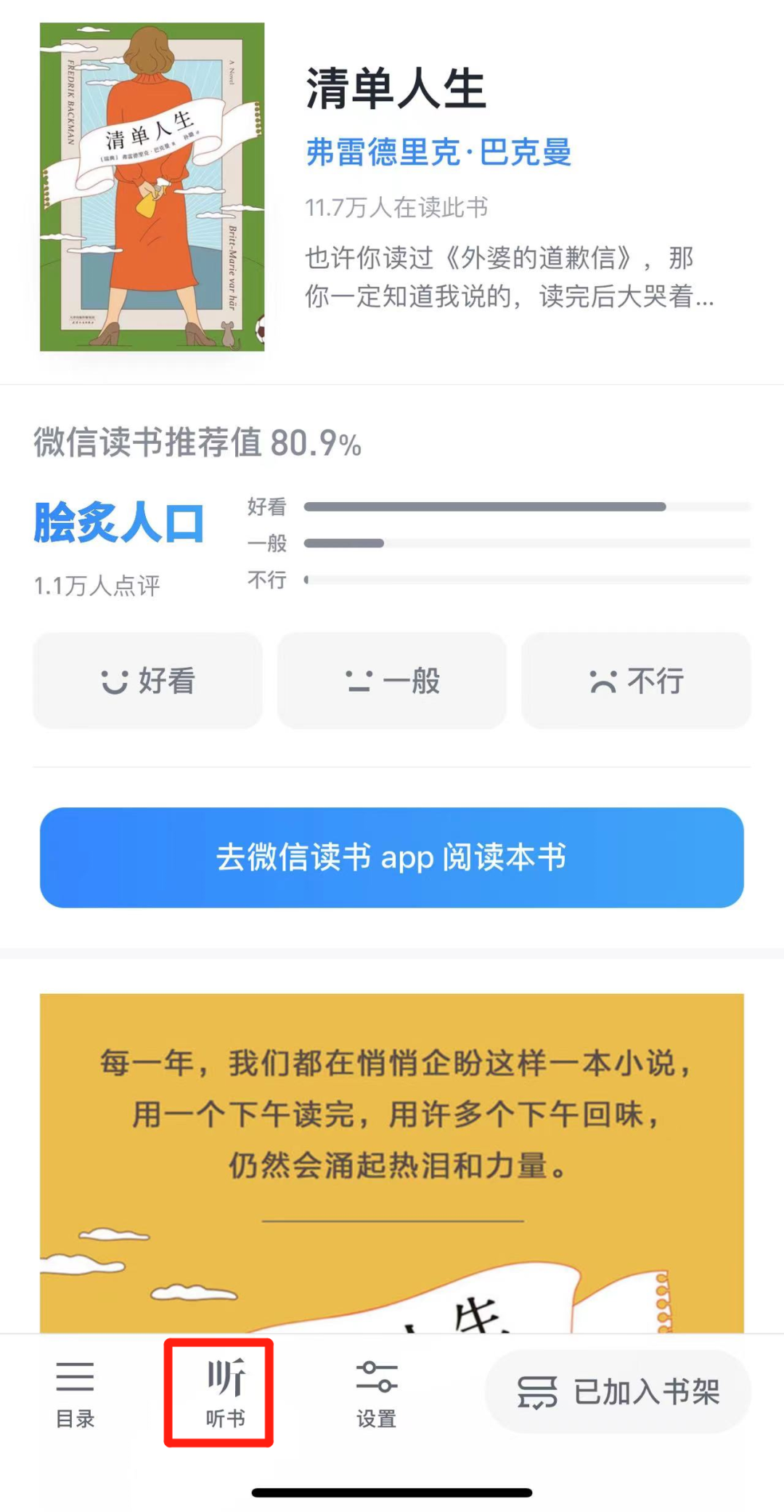 《IT时报》记者打开微信读书App,大部分书籍已具备听书功能,用户可以选择AI男声、AI女声、AI中年男声等多种音色。若听一些历史类、经济类等不需要太多感情色彩的书籍,AI声音和真人声音听起来基本没有差别。