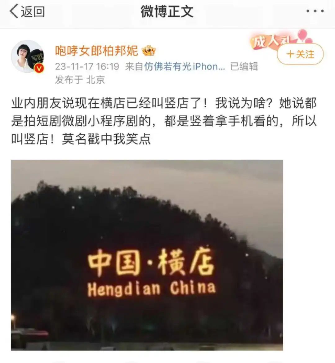 奇葩说辩手、编剧柏邦妮也在微博分享了和业内朋友的对话,提到“现在横店已经叫竖店了”“都是拍短剧微剧小程序剧的”,足见如今短剧盛况。