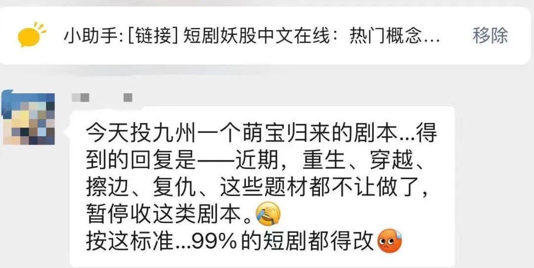 据同行爆料,某新媒体社群还传出消息称“近期重生、穿越、擦边、复仇等题材都不让做了,暂停收这类剧本”。