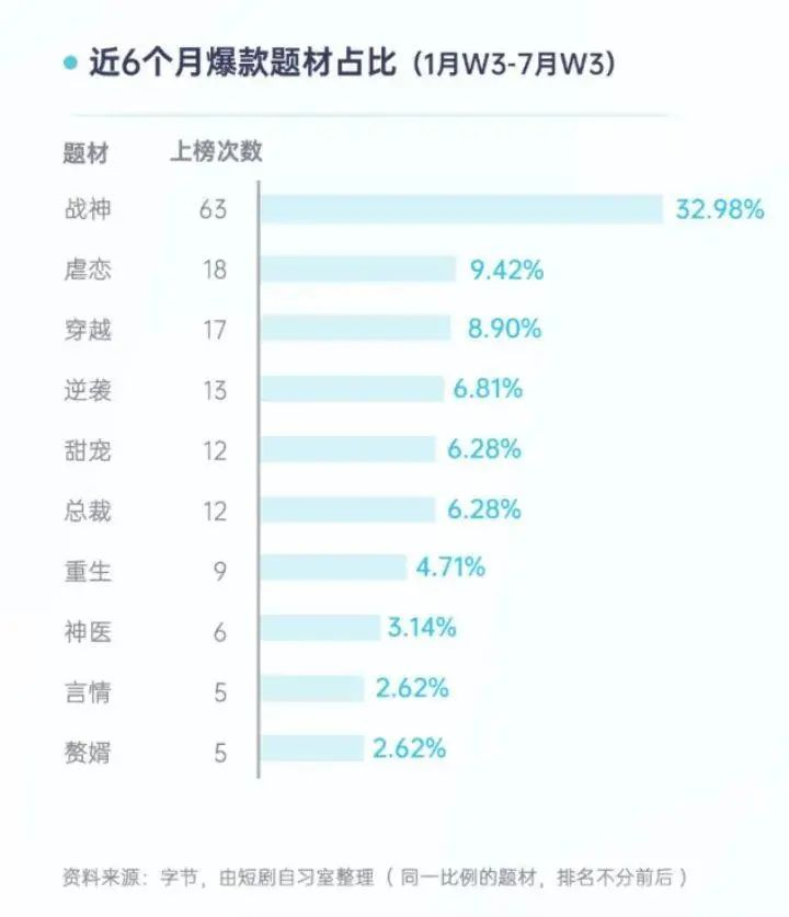 据短剧自习室整理的数据,在今年1月-7月的爆款短剧里,90%的题材仍然以“爽”为主,如战神、穿越、逆袭、重生等。“爽感”虽好,但需要把控尺度,不能一味夸张,与现实脱节。