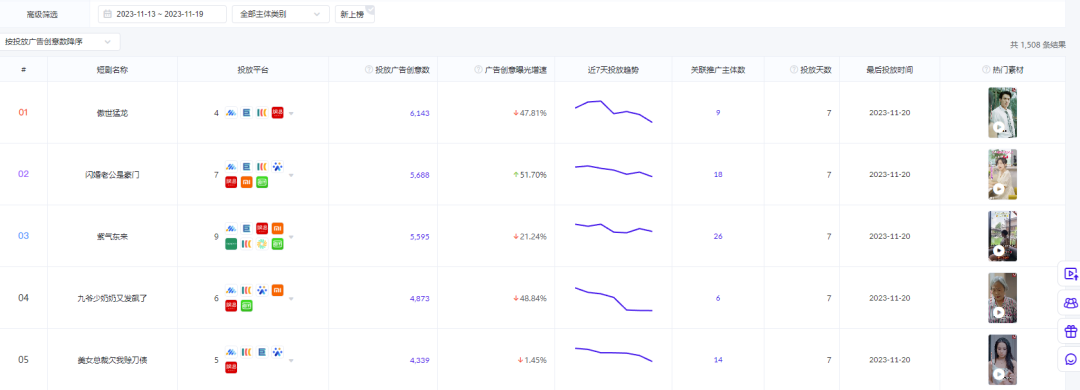 近7天短剧推广排行榜第五名中,仅有一部短剧曝光增速呈上升趋势