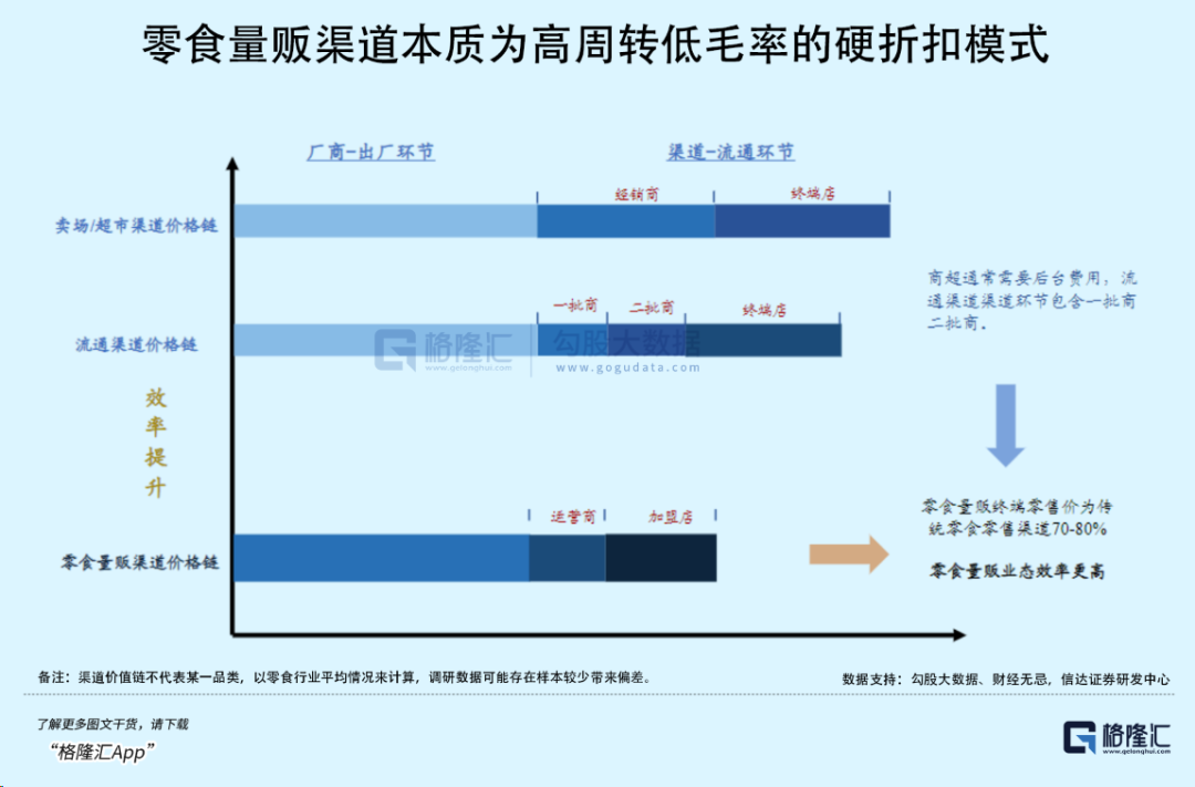比起商超、便利店,零食品牌方更愿意将货卖给能够大量采购,0账期货到付款的折扣店。据机构分析,折扣店的售价对比超市、专营门店等渠道普遍有30%的价格优势。