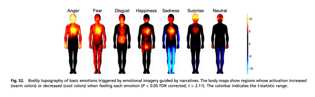 结果发现,在情绪活动中,脑部几乎参与了所有的情绪感受,胸部参与了大部分的积极情绪感受,而消化系统几乎参与了所有的消极情绪感受,比如愤怒、恐惧、厌恶与悲伤。