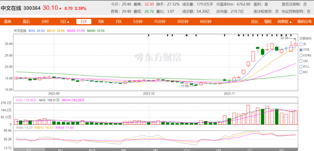 而借着ReelShort的爆火,中文在线(300364.SZ)在A股股价也迅速从10月23日的12.01元/股暴涨到11月20日的29.40元/股,近一月涨幅148%!