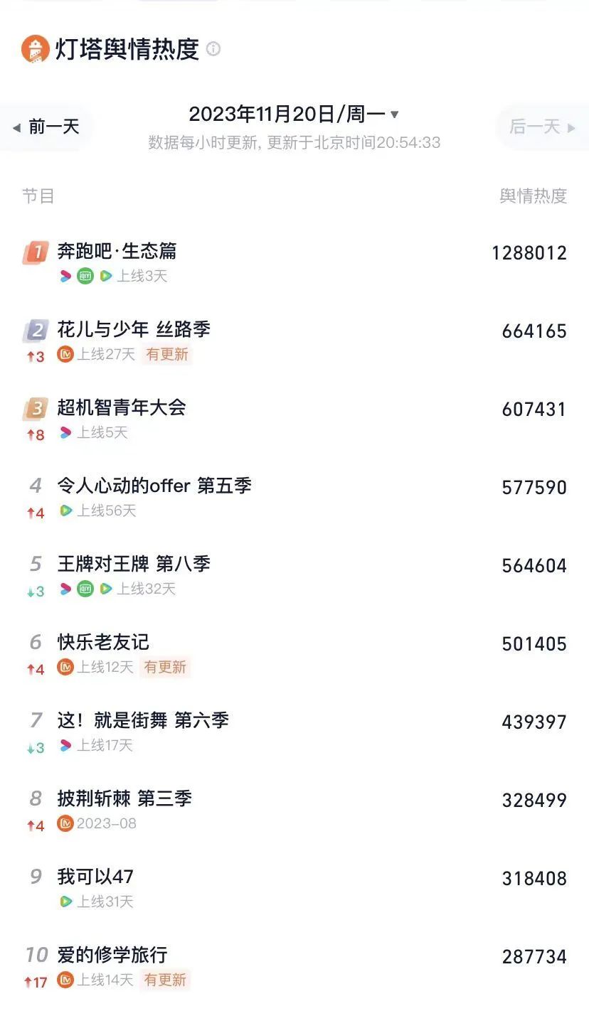 从全平台的内容布局来看,Q4综艺的主体内容基本上依赖于占比较多的综N代节目IP。灯塔专业版显示,11月20日全网综艺舆情热度TOP10中,综N代占据七席,全新的节目IP更像是锦上添花一般的存在。而这似乎也意味着,相对于过往大刀阔斧的创新而言,求存求稳才是各家当下布局综艺的核心策略。毕竟,经典的综N代IP 既沉淀了用户基本盘与内容口碑,无论在节目招商还是内容创新上都更有胜算。