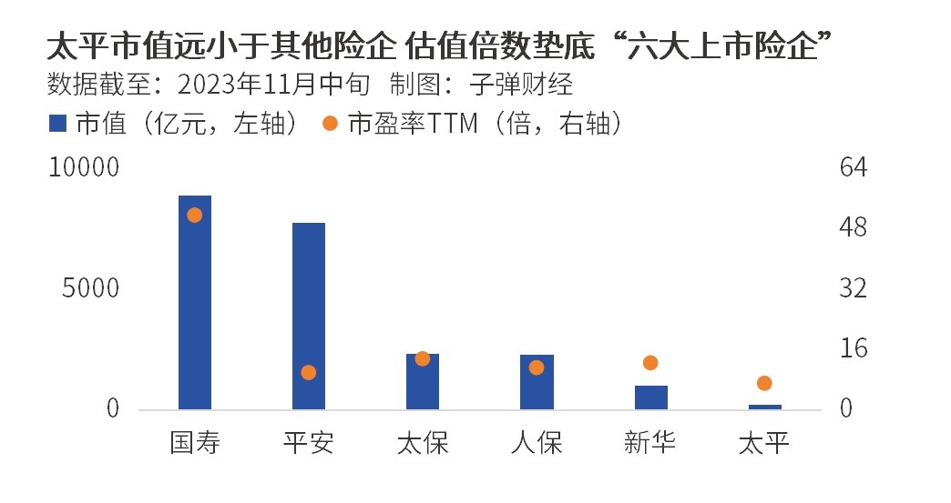 对于这样的业绩表现,市场“用脚投票”,给出中国太平偏低的市值和估值倍数——虽然是中管金融企业,但中国太平的市值合人民币只有约200亿元。对比来看,和市值分别约9000亿元和2300亿元的国寿、人保差距甚大。在上述“六大上市险企”中,远落后于其他几家。