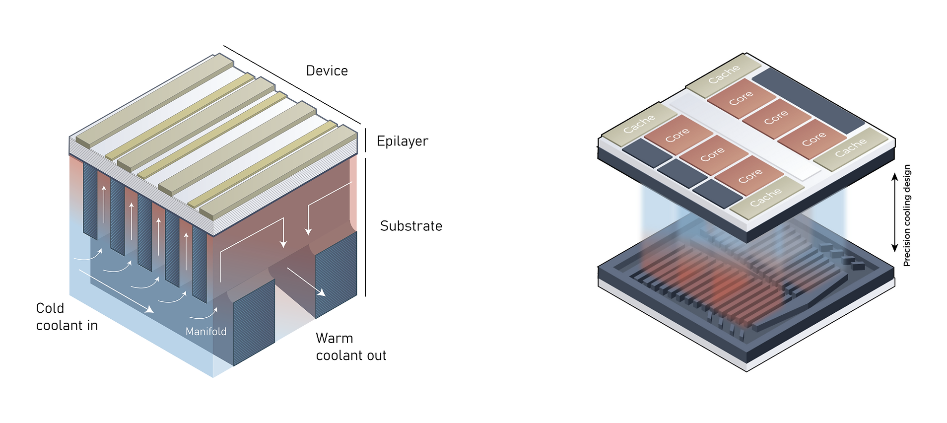 Corintis技术的核心在于一体式3D微观通道网络的设计与制造。在Corintis,芯片和微流体冷却通道网络从一开始就是一同设计的。Corintis在硅基板上涂覆的氮化镓层上蚀刻出长30微米、深115微米的狭缝,利用特殊的气体刻蚀技术扩大狭缝,形成泵送液体冷却剂的输送通道,再用铜密封住氮化镓层上的微小开口,并继续在上面制造器件。微通道被蚀刻在基板内,并与芯片上最容易升温的部分精确对齐。这让液体冷却剂能够与硅芯片直接接触,将散热速率提高10倍,冷却性能提高50倍。