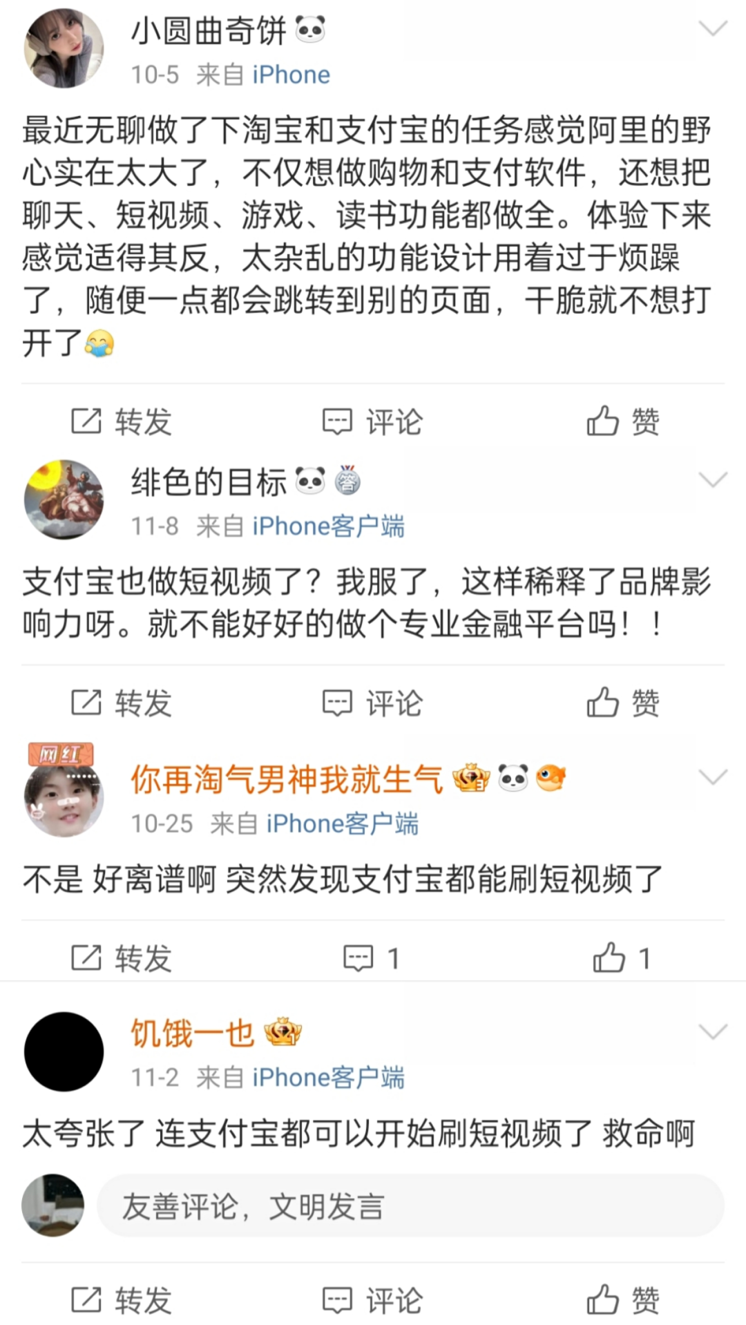 支付宝的用户心智被支付宝平台是一个支付工具、生活工具占领,这一点,在平台推出短视频入口时被网友频频质疑就有体现。