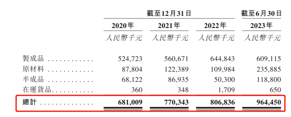 公司存货由制成品、原材料、半成品和在运货品组成,其中制成品为存货的“大头”。报告期内,制成品金额分别为5.25亿元、5.61亿元、6.45亿元和6.09亿元,2020年-2022年呈连年增长趋势。