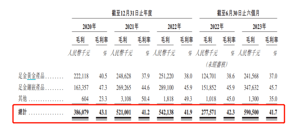 足金镶嵌产品不仅收入大涨,毛利率水平也保持高位。报告期内,老铺黄金毛利率分别为43.1%、41.2%、41.9%和41.7%。截至2023年上半年,足金镶嵌产品毛利率高达45.7%,远高于当期综合毛利率41.7%。