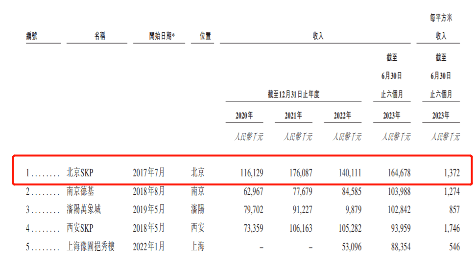 其中,北京SKP的门店收入常年排名第一,截至2023年6月末,该店收入为1.65亿元,每平方米收入137.2万元。此外,南京德基店和洛阳万象城店的收入也名列前茅。