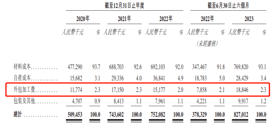 报告期内,公司外包加工费分别为1177.4万元、1715万元、1517.7万元和1884.6万元;自产成本金额分别为1568.2万元、2933.6万元、3684.1万元、2842.9万元。因此,以加工成本分布来计算,公司的外包加工的比例并不低。2023年上半年,外包加工成本与自产成本的比重约为4:6。