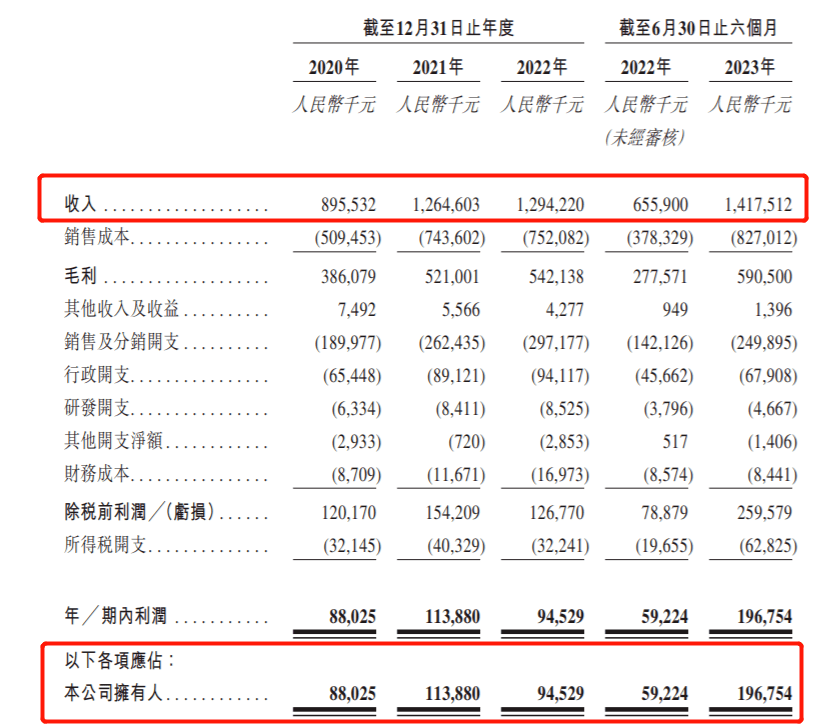 招股书显示,2020年-2023年前六个月(以下简称“报告期”),公司实现营业收入8.96亿元、12.65亿元、12.94亿元和14.18亿元;同期,公司净利润分别为8802.5万元、1.14亿元、9452.9万元和1.97亿元。