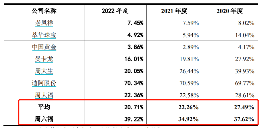 此外,2023年6月29日,老铺黄金的同行公司周六福在深交所主板更新了招股书。招股书显示,2020年-2022年,周六福的毛利率分别37.62%、34.92%和39.22%,相比周六福,老铺黄金的毛利率也处在较高的水平。