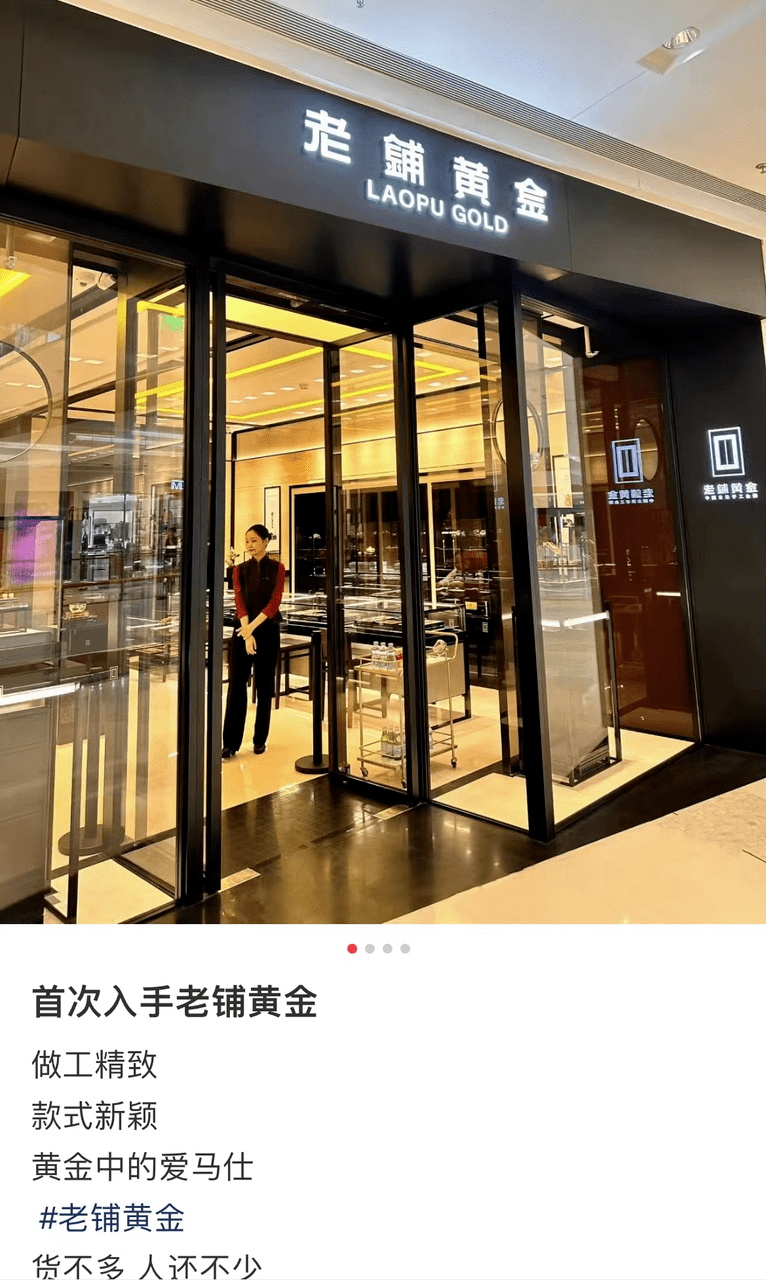 开在奢侈品云集的高端商场,仿佛让老铺黄金也镀上了一层奢侈品的“光环”,且店内产品主要以“古法手工金器”为卖点,产品工艺更为复杂,有消费者称老铺黄金是“黄金中的爱马仕”。