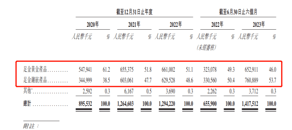 值得注意的是,老铺黄金的主要收入来自足金黄金产品和足金镶嵌产品。其中,报告期内,足金黄金产品收入分别为5.48亿元、6.55亿元、6.61亿元和6.53亿元;足金镶嵌产品收入分别为3.45亿元、6.03亿元、6.3亿元和7.61亿元。2023年上半年,足金镶嵌产品收入大涨,为老铺黄金贡献超一半收入。