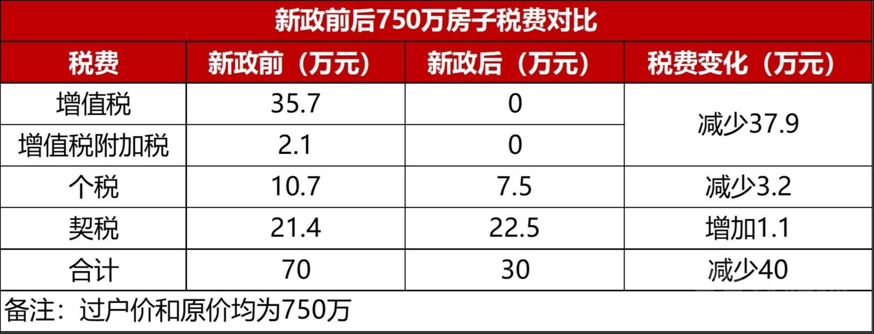 假设购买1套总价750万的房子,在新政前,属于非普通住宅,增值税和个税累计需交48.5万,新政后,只要建筑面积小于144平米或套内建筑面积小于120平米,均属于普通住宅,增值税减免,个税也可以减少30%。新政后,整体税费减少40万。
