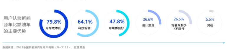而智能化能力,也正在不断改变着燃油车时代“老司机”的心智。据巨量报告在4月发布的《中国新能源汽车趋势洞察白皮书2023》显示,科技智能已经成为新能源车超越燃油车的第二大亮点。