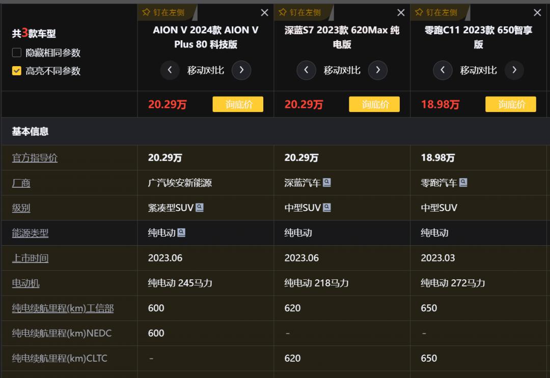 数据显示,零跑主力销售产品从2022年“老头乐”的T03,切换至B级SUV的零跑C11上,3月份还推出了B级轿车(零跑C01)。零跑当下的产品售价区间已调整至15-20万区间。价格调整方面,8月零跑汽车旗下C11、C01部分车型售价进行调整,最高下调2万元。对比同级的零跑C11、AION V、深蓝S7,看以看到,纯电车同级对比下,零跑在续航、汽车空间、智能化配置上与其他产品相近。但便宜1万出头的价格,让零跑C11获得了更高的竞争力。