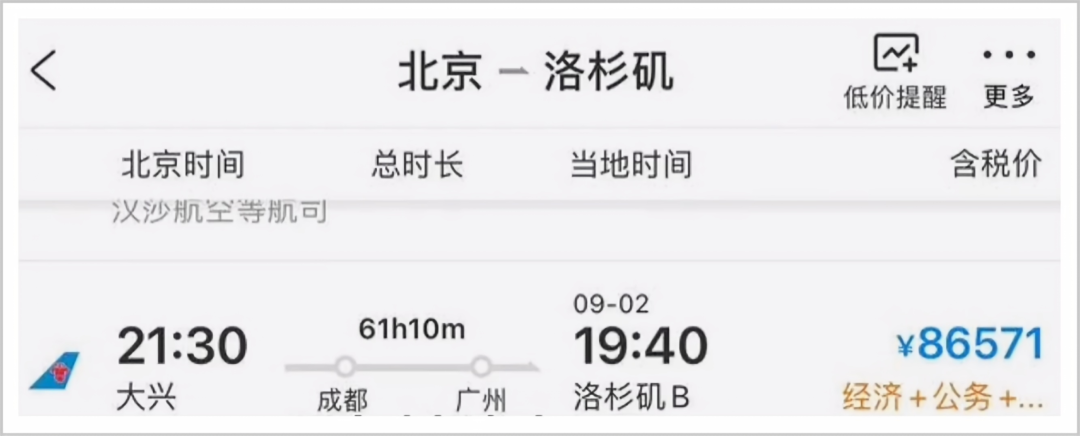 2021年4月,随着美国对中国留学生的限制解除,大量留学生开始准备赴美。机票价格也随之疯狂飙升,经济舱飞涨到两三万,商务舱更是贵得离谱——一张从北京飞往洛杉矶,需要在成都和广州中转两次耗时61小时的机票,需要八万多人民币。