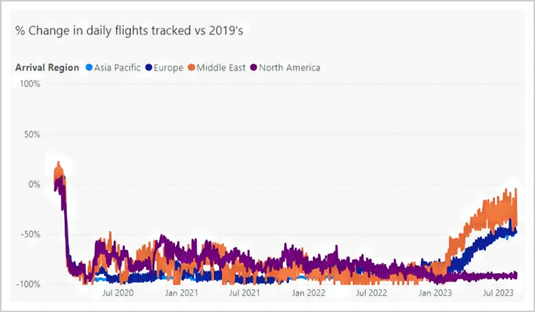2023年以来,疫情对交通的影响已经微乎其微,全球出行市场井喷式增长,中国民航业也迎来复苏:国内航线基本恢复至2019年的水平,国际航线也在持续恢复。