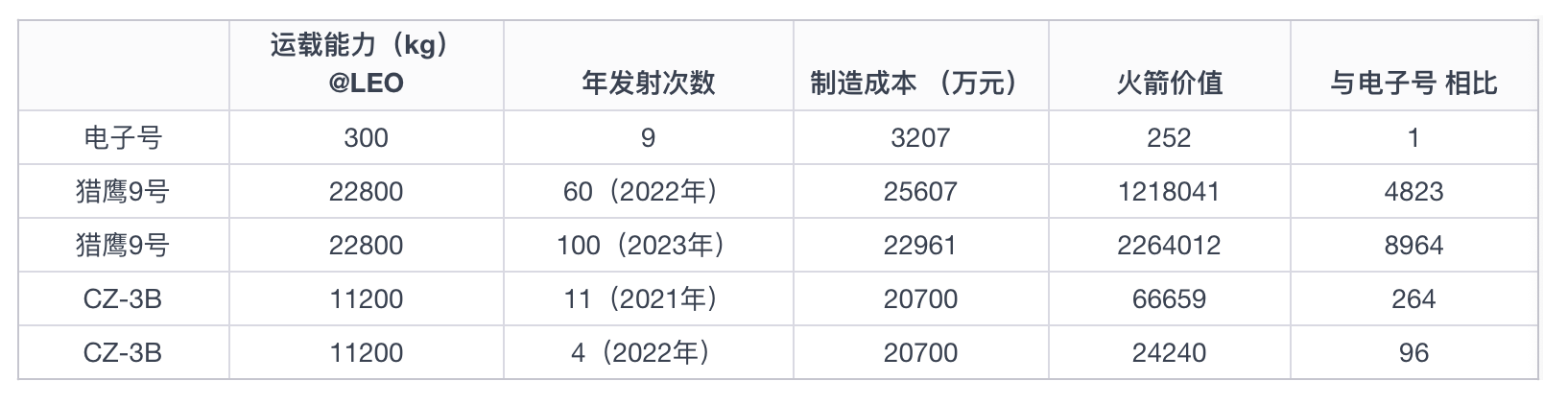 我们以每次满载来粗略对比下电子号、猎鹰9和长征3B世界各型火箭的价值,详见表1: