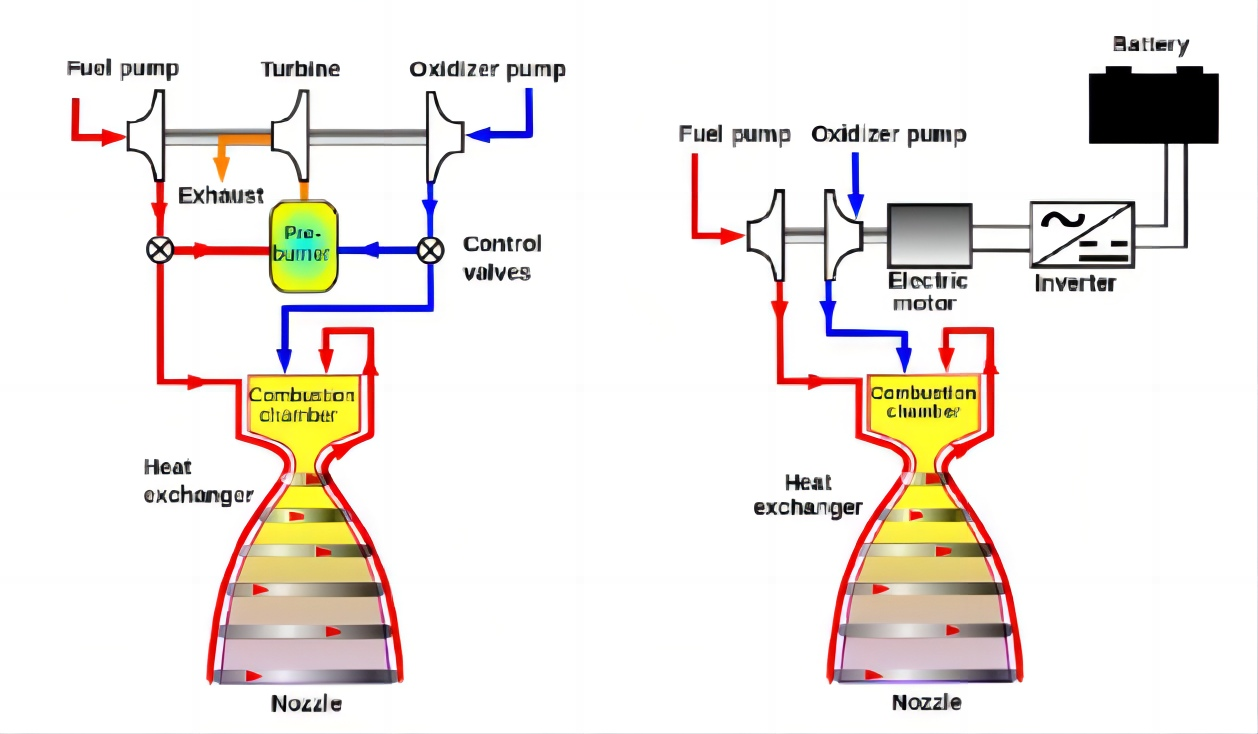 图:燃气发生器循环液体火箭发动机(左)和电动泵循环液体火箭发动机(右)