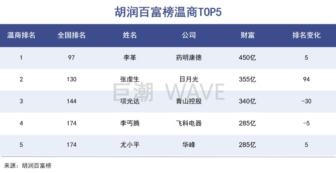 2023年10月份,最新的胡润百富榜出炉,李丐腾已经退居温商第四名。排在他前面的,分别是药明康德的李革,日月光的张虔生和青山控股的项光达。排在李丐腾后面的,有华峰、正泰等当地知名企业的掌舵人。