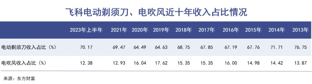截至2023年上半年,飞科电器电动剃须刀收入占总营收比例持续保持在70%左右,是第二大产品电吹风的4-5倍。