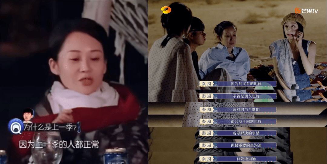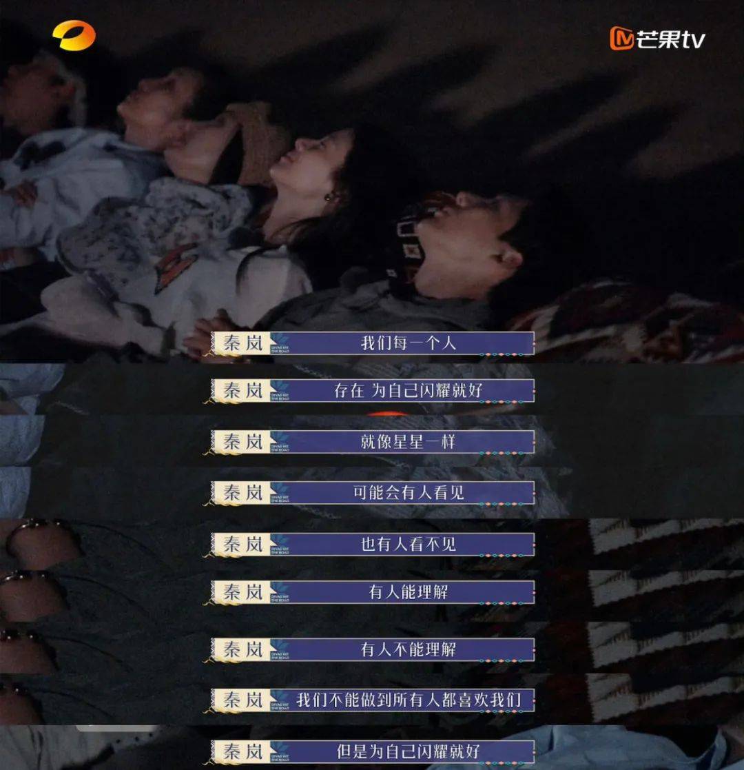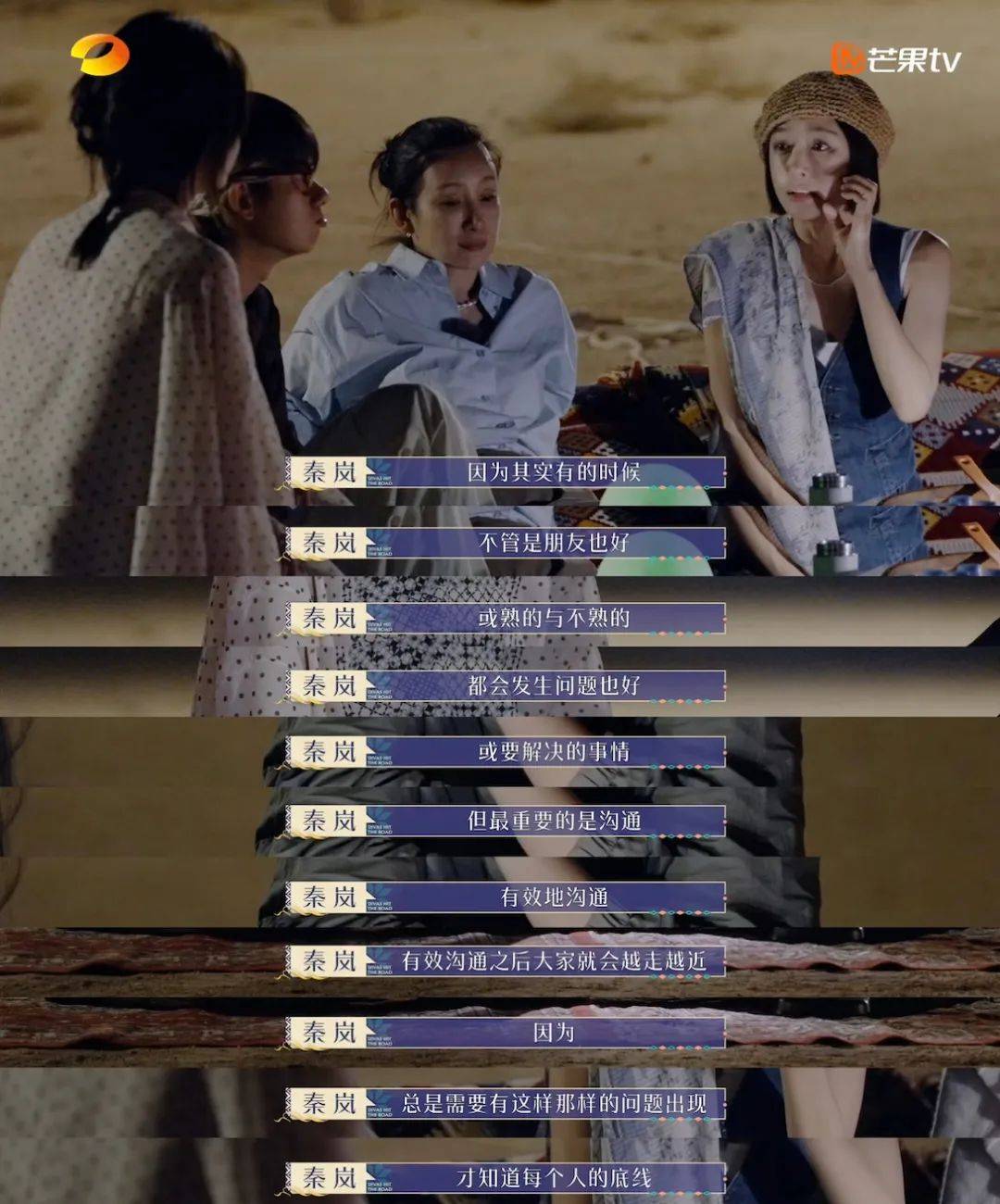 在第四期星空下的古城沙漠,七人团首度围炉敞开心扉,辛芷蕾一吐对王安宇音乐节安排的心中不快,其坦诚表达却令安宇心里面石头落了地,对此秦岚“有效沟通才会越走越近”“每个人存在为自己闪耀就好”的几番总结令人醍醐灌顶,这些封神金句对秦岚的口碑加持不亚于一部热剧。