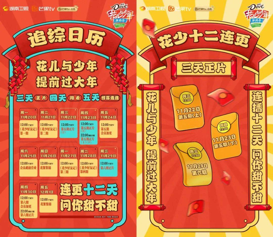 很显然,能否快速响应舆情火速开发衍生内容,已成当下综艺创制核心能力之一。这不,《花少5》正片才更5期,为了避免断更给舆论场相关话题降温,《花少5》目前在排播上已成功达成“连更十二天”不间断追综体验。