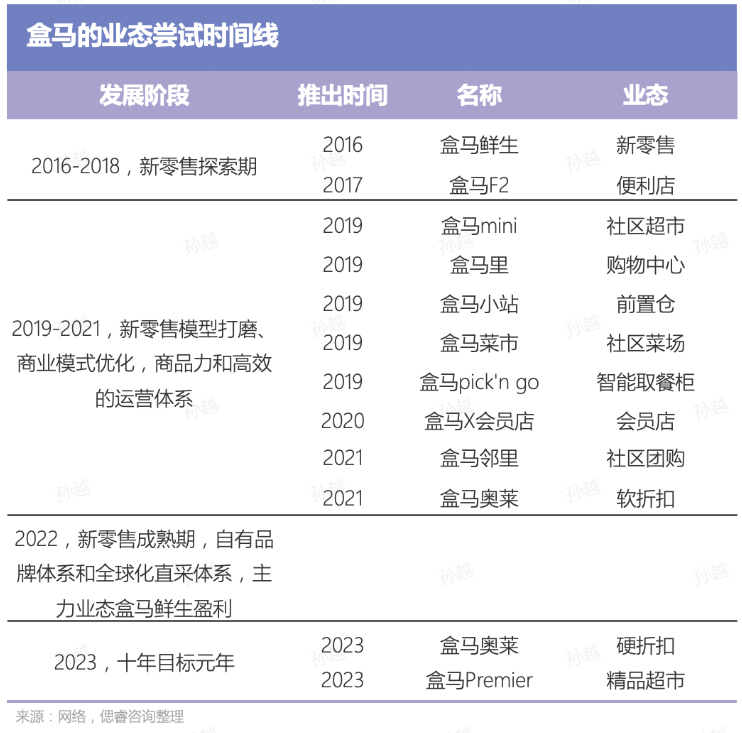 这几年,盒马密集试水了包含盒马小站、盒马里、盒马菜市、盒马F2、盒马Mini店、盒马邻里、盒马X会员店、盒马奥莱、盒马Premier在内的多种零售业态,试图通过不同细分场景来满足不同用户需求,从而扩大版图。但时至今日,试水的大部分零售业务都被盒马放弃,保留下来的主要是盒马鲜生、盒马X会员店以及最近集中发力的盒马奥莱。