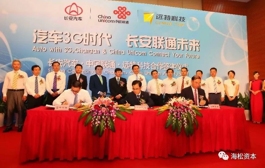 图 | 2010年,远特科技(北斗智联前身)、长安汽车、中国联通集团三方签署战略合作协议,推出车联网系统(后排左5起 远特科技陈立光、中国联通总经理陆益民、长安汽车董事长徐留平)
