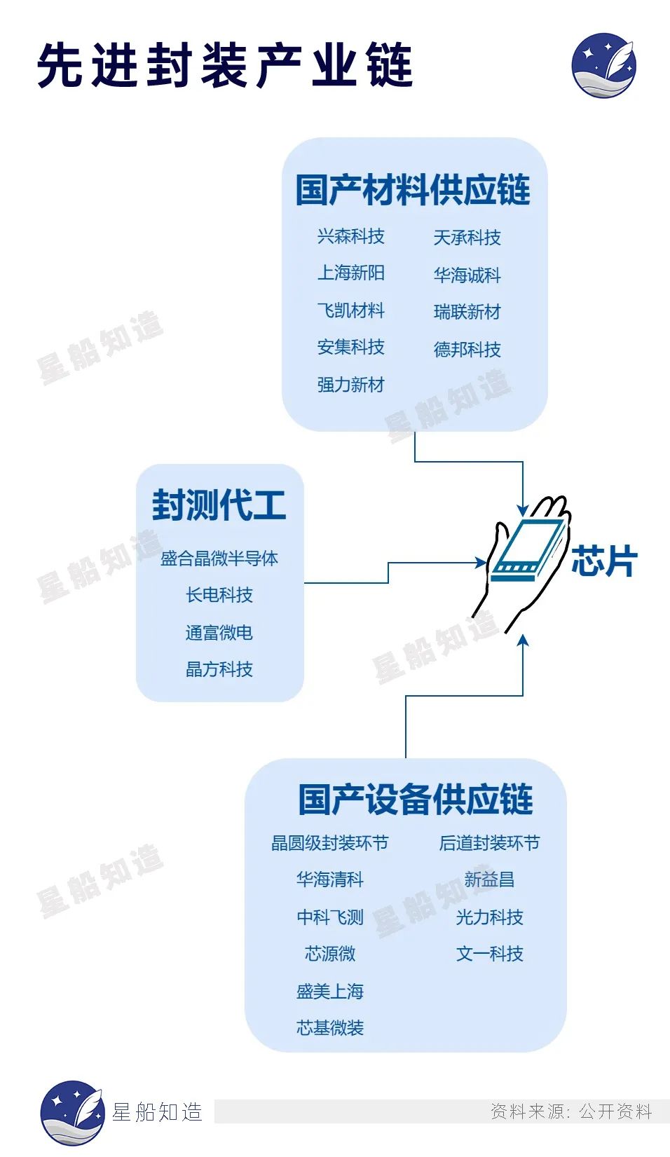 半导体封装是半导体制造工艺的后道环节,封装环节的价值占整个半导体封测部分的80%-85%。先进封装则是制造最先进半导体的关键技术,能够实现半导体的小型化、高集成。产业链及主要企业见下图