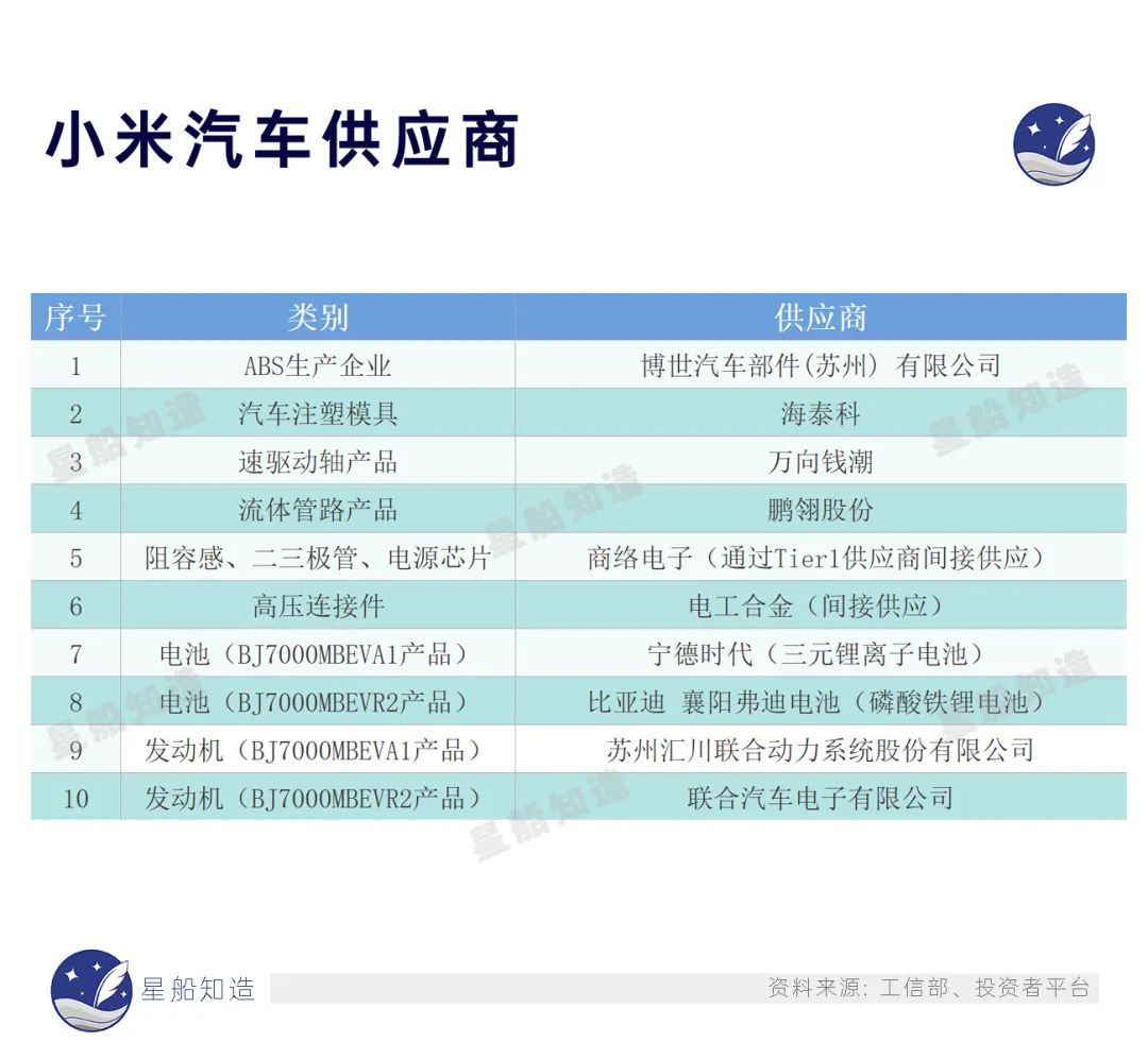 《星船知造》从工信部公布的小米汽车申报车型信息来看,小米汽车申报的汽车产品商标是小米牌,申报的企业却是北京汽车集团越野车有限公司,电池供应商则是宁德时代和比亚迪。具体见下图