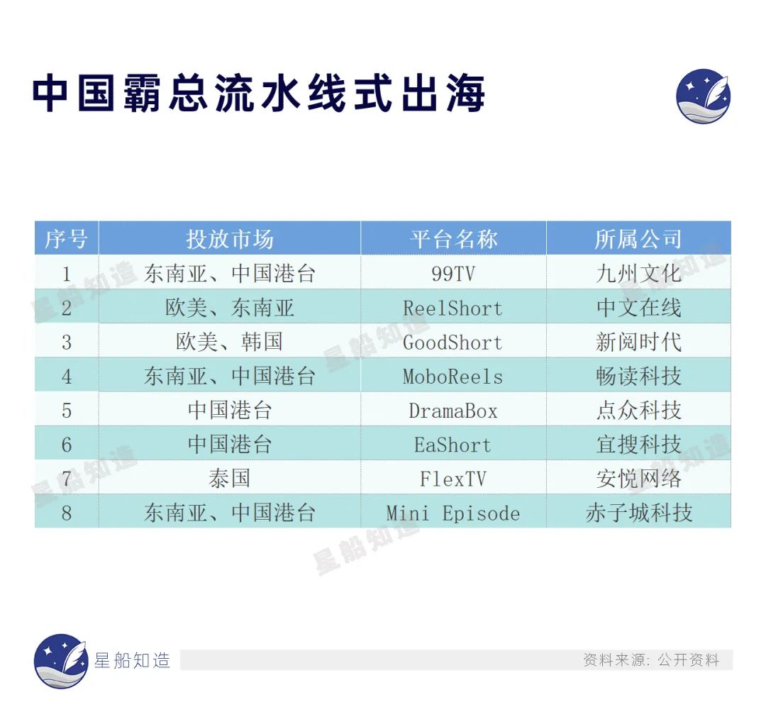 目前看,吃到第一波红利的,还是那群有网文出海经验的平台,靠多年的用户沉淀和数据积累,在霸总短剧出海的初期拔得头筹,见下图