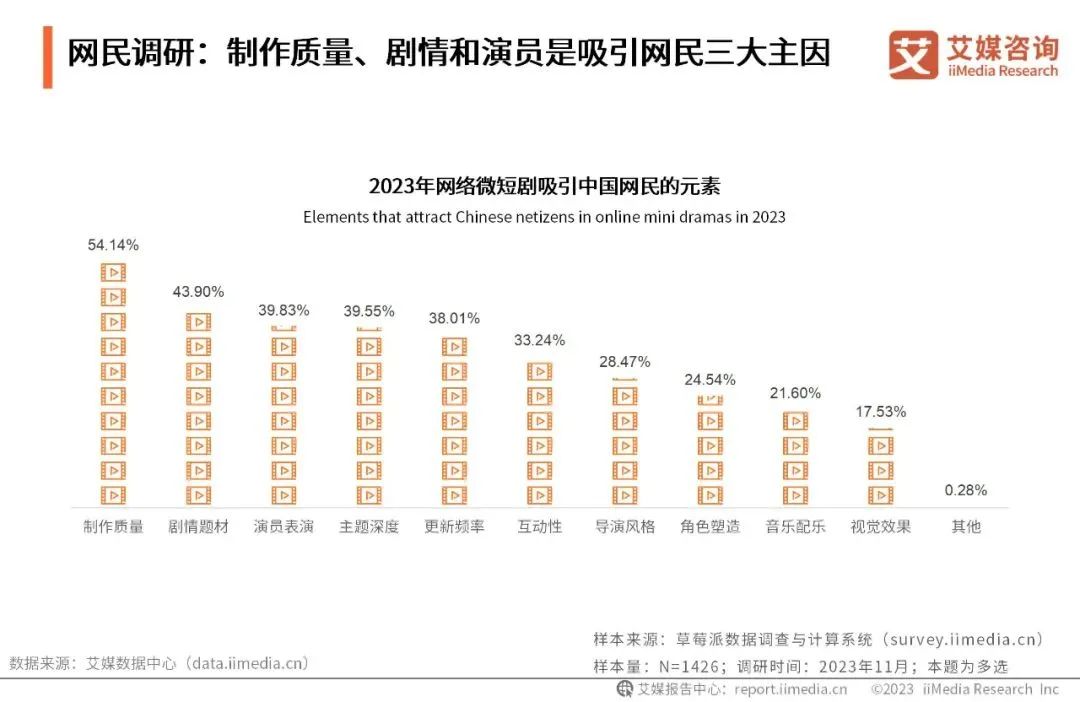 内容精品化是整个影视行业不可逆的发展趋势,网络微短剧当然也不例外,根据艾媒咨询统计数据显示,54.14%的网友会因为微短剧的制作质量精良而被吸引,占比最高,内容质量已经成了影响一部微短剧能否成功最重要的因素。